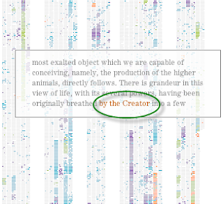 "On the Origin of Species: The Preservation of Favoured Traces" by Ben Fry is a truly amazing Talmudic site that graphically illustrates in a compact fashion the how the six editions of On the Origin of Species evolved from 1859 to 1872. You just mouse over the changing image (you can set the progression to fast or slow) and you read the text. (Hat tip to Wired.) Fry explains,